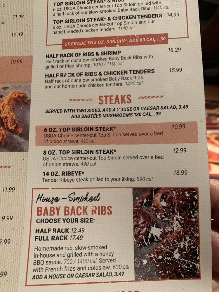 6 oz. center-cut top sirloin with a half rack of our slow-smoked baby back ribs. Upgrade to 8 oz. Sirloin for an additional charge